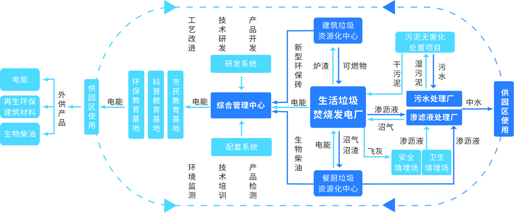 盈峰環境循環經濟產業園模式以生活垃圾焚燒發電廠為園區核心,統籌各類生活垃圾處置中心的配套建設,對各類生活廢棄物進行無害化、減量化、資源化處理,輸出電能、建筑材料、生物柴油等副產物,為園區生產、生活提供服務。